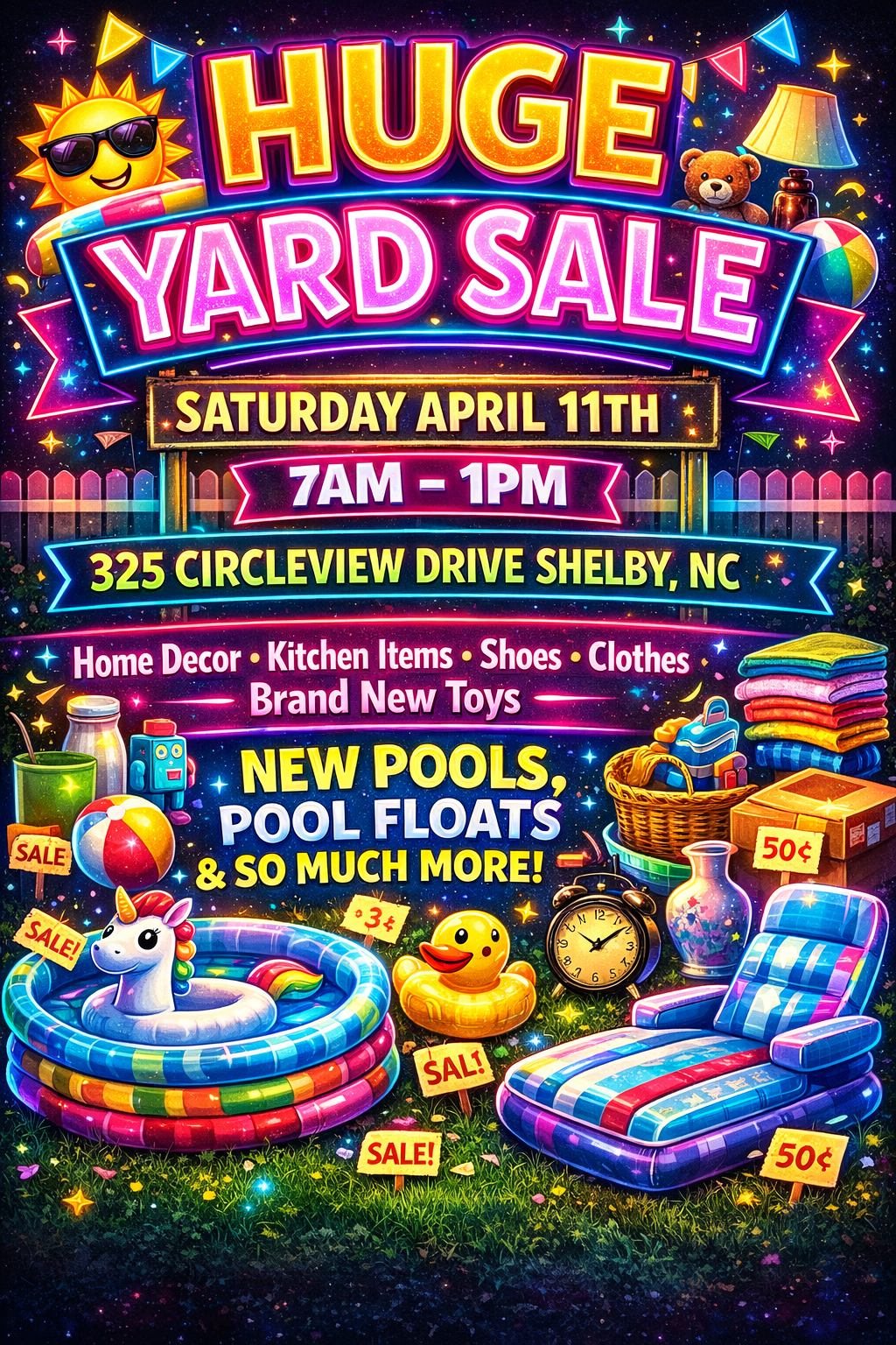 Saturday, April 11th, 2026 from 7:00AM-1:00PM. Clothes, Shoes, Home Decor, Kitchen Items, Pool floats, Brand New Pools, Brand New Toys & so much more.... y’all come see us!! 325 Circleview Drive,