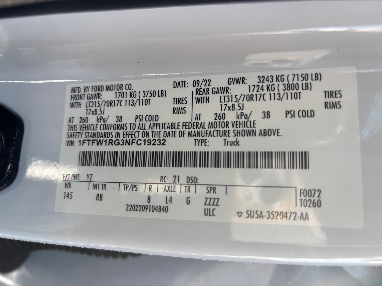 - VIN1FTFW1RG3NFC19232