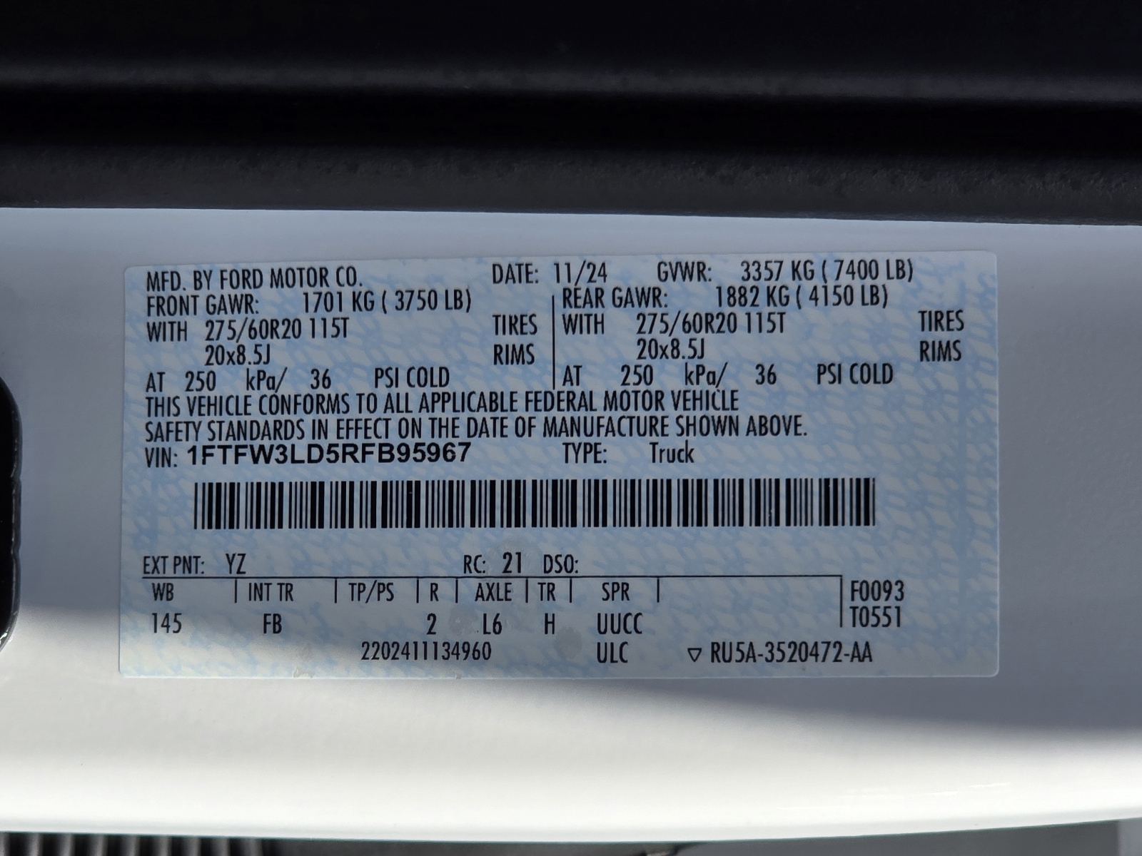 - VIN1FTFW3LD5RFB95967